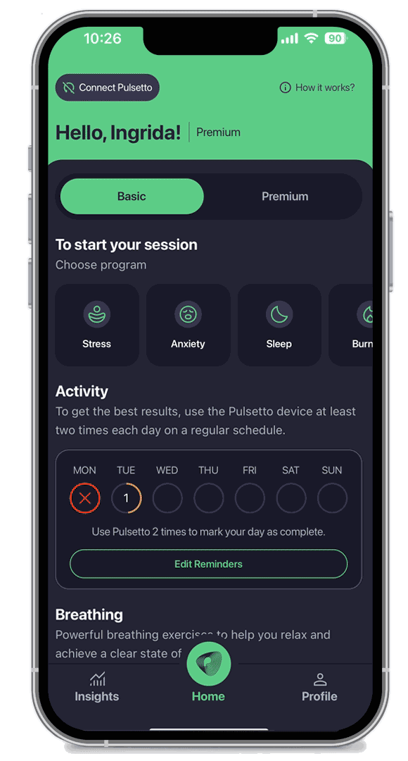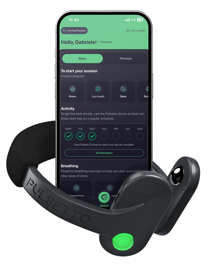 Extragift: Pulsetto Premium 14-Tage kostenlose Testversion. 3 zusätzliche Stimulationen, 11 einzigartige geführte Meditationen, 54 Atemübungen, 1200 positive Affirmationen und mehr.