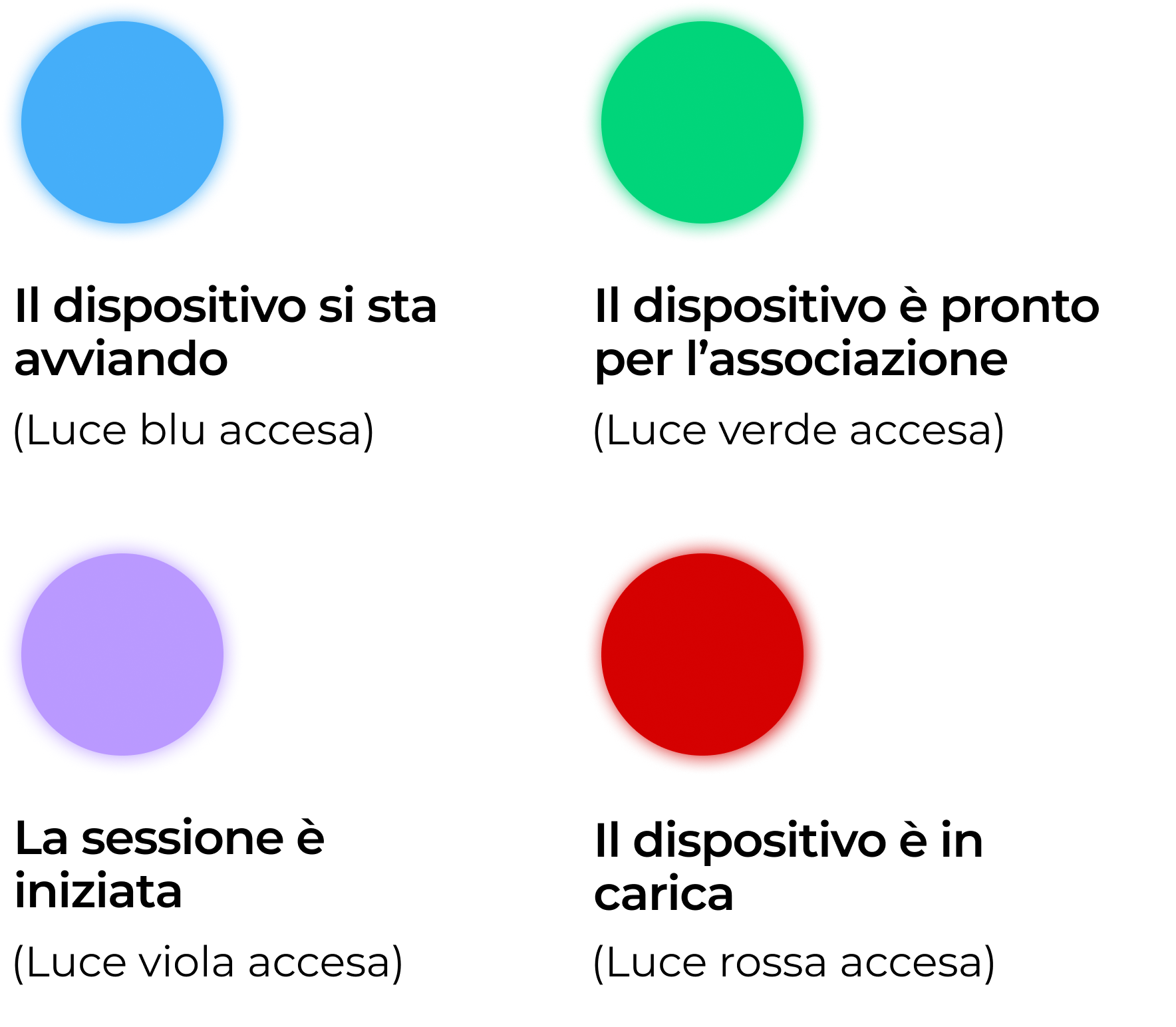 Simboli LED del dispositivo e il loro significato. Ogni simbolo indica una funzione o uno stato specifico, per aiutarti a utilizzare Pulsetto in modo semplice e intuitivo.
