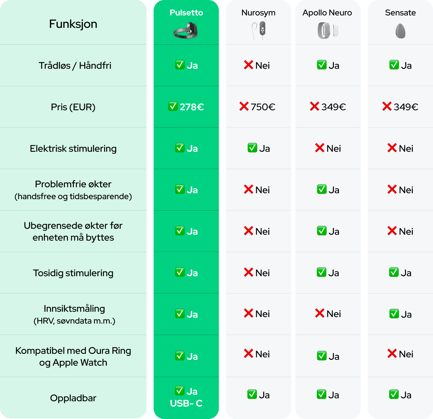 Merk: Pulsetto anbefales ikke for personer med aktive, implanterbare medisinske enheter, som pacemakere, høreapparatimplantater eller andre elektroniske implantater. Rådfør deg med legen din før bruk for å sikre at det er trygt for deg.